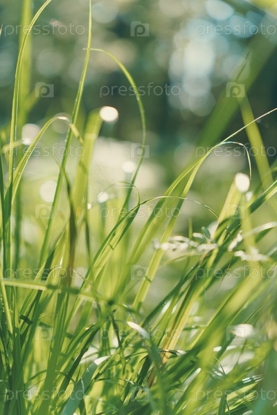 Крупный план зеленых травинок в солнечном свете с эффектом боке