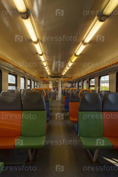 Интерьер пустого вагона поезда с разноцветными сиденьями