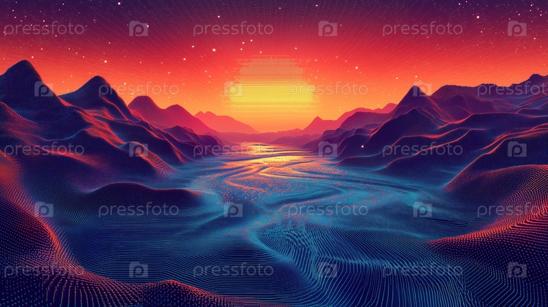 Футуристическая цифровая долина с пикселизированной рекой под звездным небом