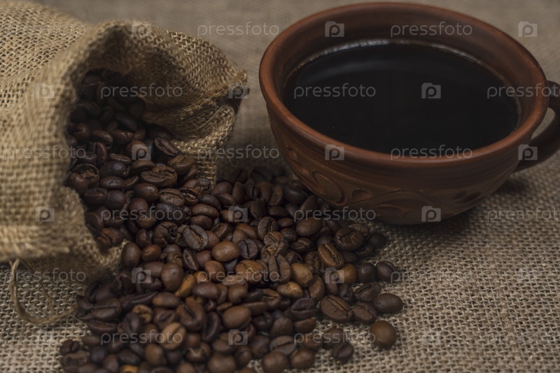 Керамическая чашка черного кофе в деревенском стиле с мешковиной, из которой высыпаются кофейные зерна