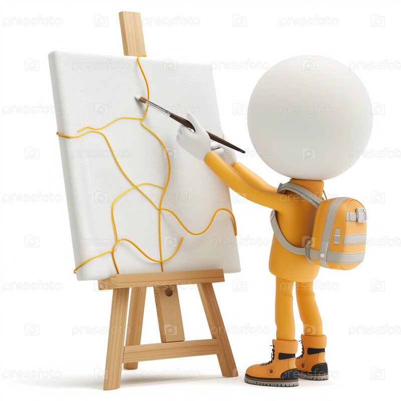 Стикмен рисует на мольберте, изолировано на белом фоне