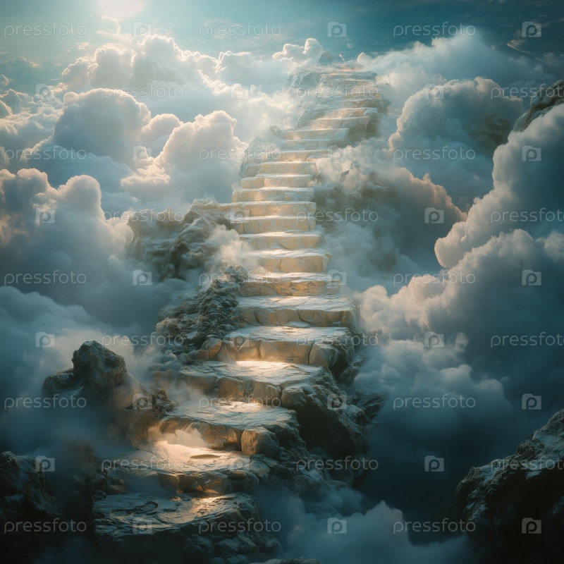Лестница, ведущая сквозь облака к сияющему свету в небе. Путь на небеса