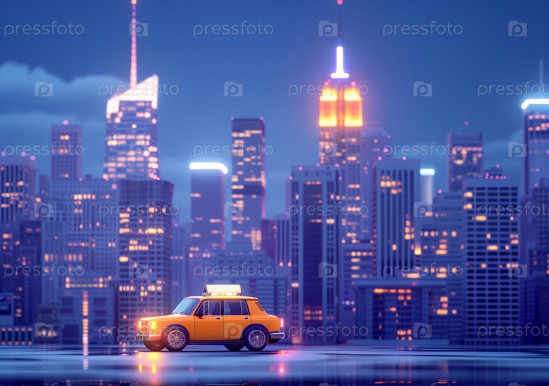 Неоновый городской пейзаж с иллюстрацией желтого такси
