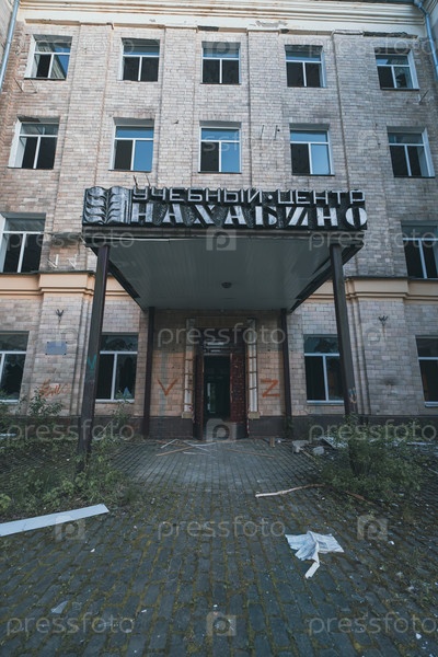 Заброшенное кирпичное здание с пустыми окнами в сумерках