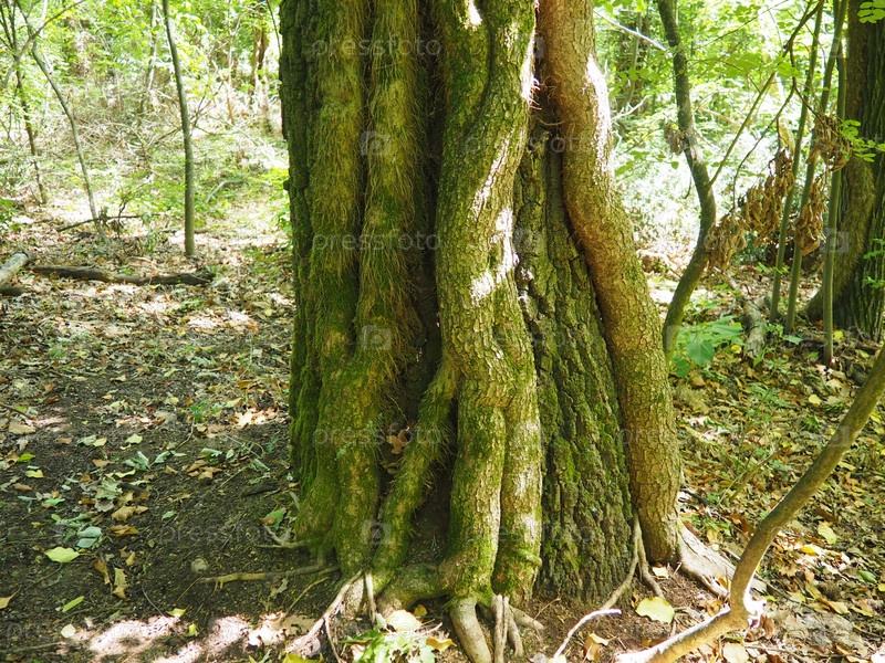 Лианы на ветвях деревьев в европейском лесу. Сербия, национальный парк Фрушка-Гора. Растение, которое находит вертикальную опору. Усики, придаточные корни, прикрепления. Лиана — жизненная форма растений