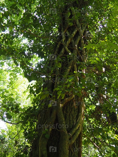 Лианы на ветвях деревьев в европейском лесу. Сербия, национальный парк Фрушка-Гора. Растение, которое находит вертикальную опору. Усики, придаточные корни, прикрепления. Лиана — жизненная форма растений