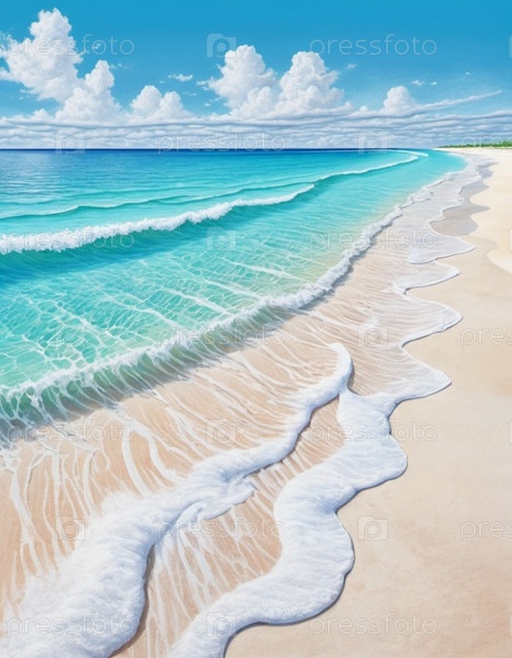 Захватывающий вид на нетронутый белый песчаный пляж на Мальдивах. Бирюзовые воды Индийского океана нежно плещутся у берега, создавая безмятежную идиллическую картину. Небо ярко-голубое, усеянное пушистыми белыми облаками