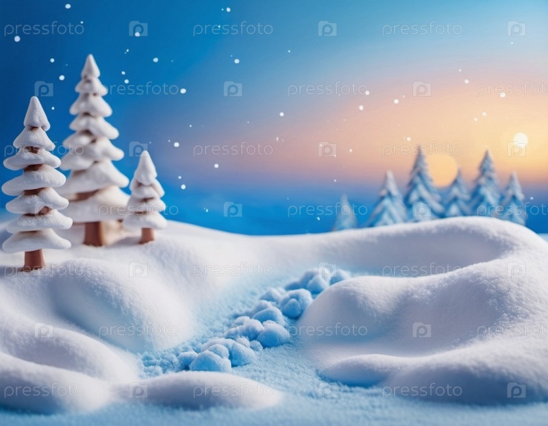 Милые рождественские елки, покрытые свежим белым снегом. Чудесный зимний лес. Новогодняя и рождественская атмосфера. Праздничная и очаровательная зимняя страна чудес. Снежинки, сугробы и холмы. Создано с помощью искусственного интеллекта