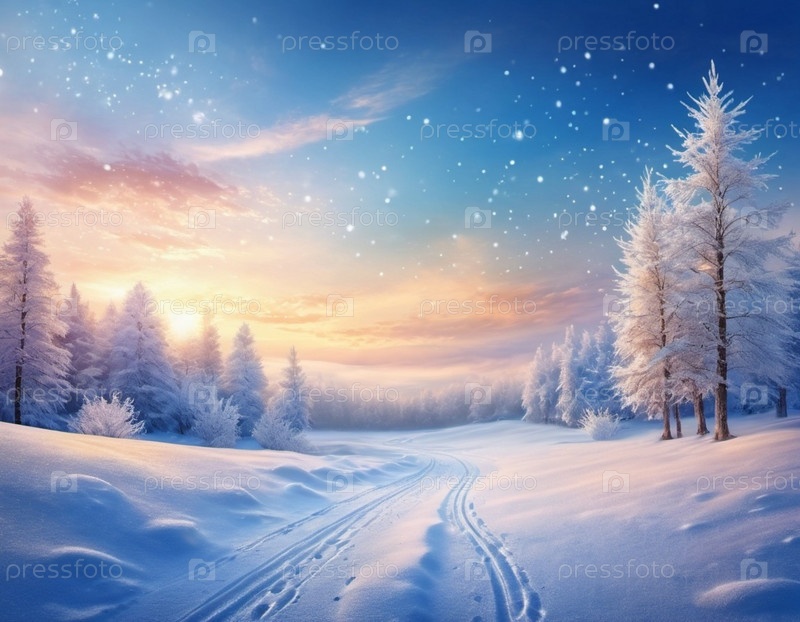 Живописная зимняя сцена с заснеженной равниной и силуэтами деревьев на фоне яркого закатного неба. Мягкий снегопад добавляет волшебный штрих, создавая спокойный и захватывающий дух пейзаж. Сгенерированный ИИ