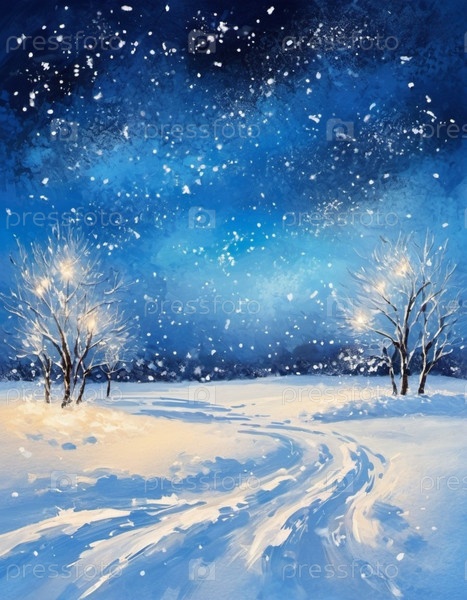 Милый рождественский пейзаж, покрытый свежим белым снегом. Чудесный зимний лес. Новогодняя рождественская атмосфера. Праздничная и очаровательная зимняя страна чудес. Снежинки, сугробы и холмы. Создано с помощью ИИ