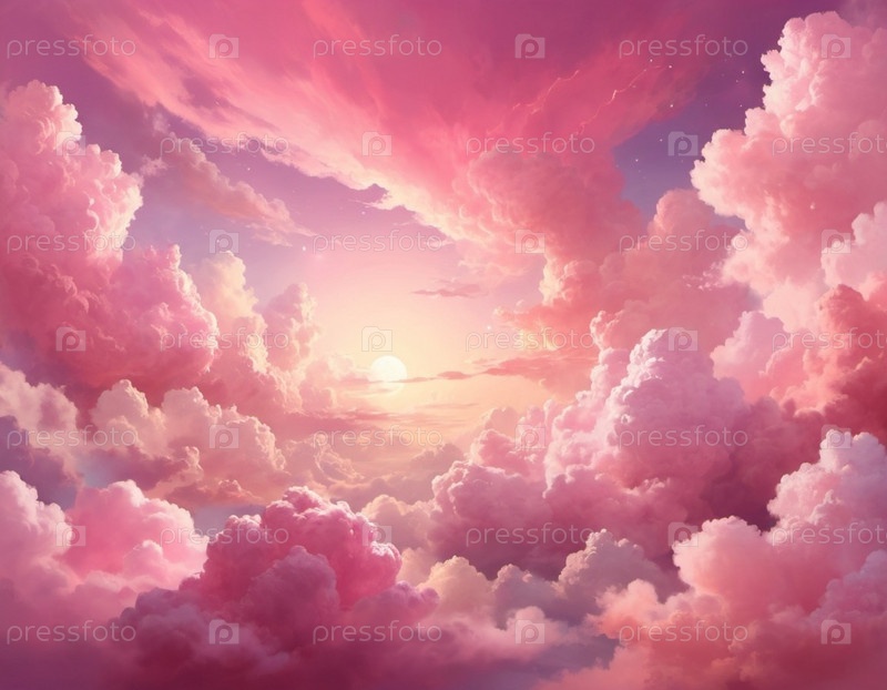 Красивые розовые пушистые облака в ярком закатном небе. Визуальное отображение. Драматическое нереальное небо с кучевыми и слоистыми облаками в атмосфере. Неизвестная планета с розовыми облаками. Луна, планеты и звезды. Искусство ИИ