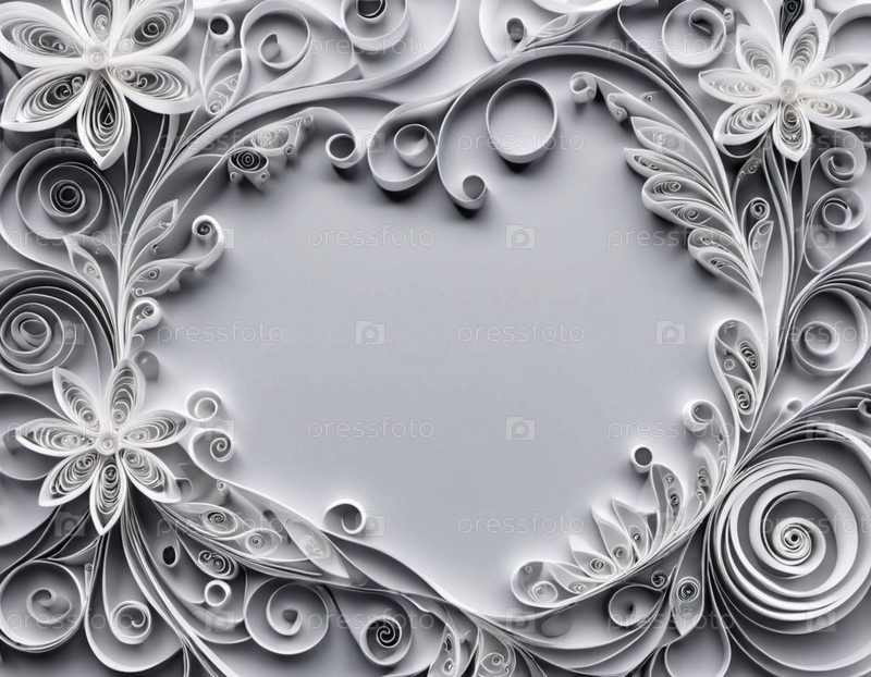 Бумажные цветы, выполненные в технике квиллинг. Цветы в оттенках серого и белого, расположены по кругу на сером фоне. Рамка с местом для копирования. Сгенерировано с помощью ИИ