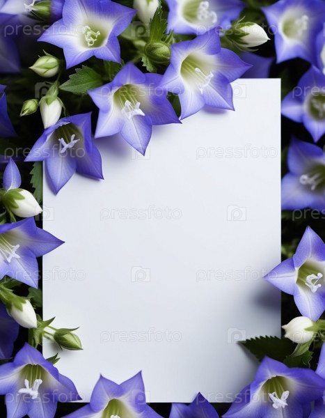 Чистый лист бумаги, окруженный рамкой из фиолетовых или синих колокольчиков. Цветы, расположенные вокруг бумаги, создают естественную красивую границу. Фон или шаблон для различных целей, пространство для копирования