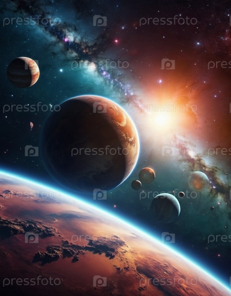 Планетарная система с несколькими планетами, большим ярко окрашенным газовым гигантом и каменистой планетой. Яркие звезды и огромное пространство темного космоса с галактикой на заднем плане. Космические просторы. Космонавтика. ИИ