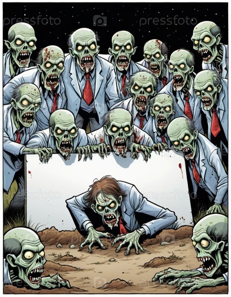 Большая группа зомби, чьи лица искажены выражением голода и разложения, держат пустой знак, их бледная, разлагающаяся кожа и пятна крови видны. Мертвые восстают на кладбище ночью. AI