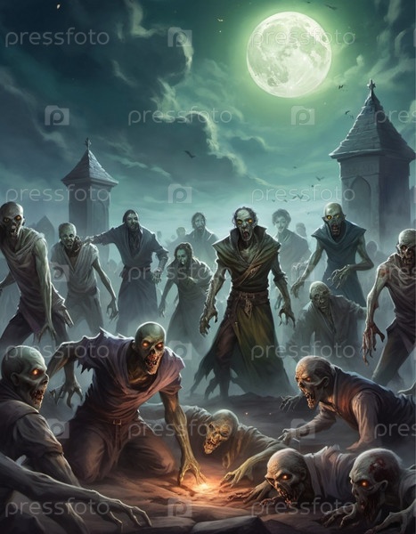 Гротескные зомби появляются из могил, разложившиеся тела освещаются лунным светом. Скелетные фигуры бродят среди надгробий, в то время как другие ползают по земле, демонстрируя свой ужасный вид. ИИ