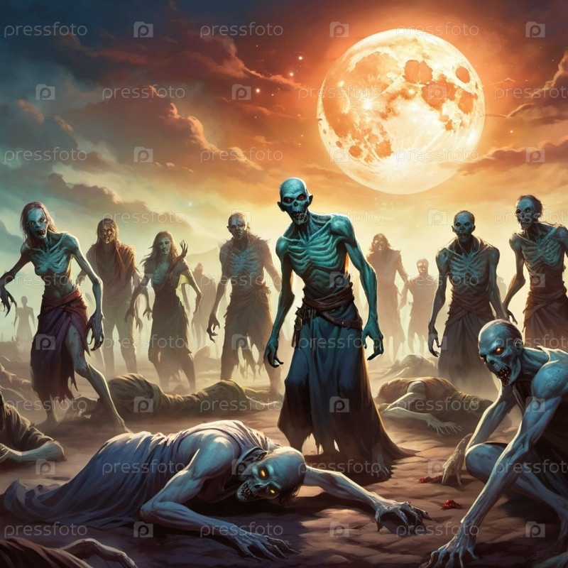 Гротескные зомби появляются из могил, разложившиеся тела освещаются лунным светом. Скелетные фигуры бродят среди надгробий, в то время как другие ползают по земле, демонстрируя свой ужасный вид. ИИ