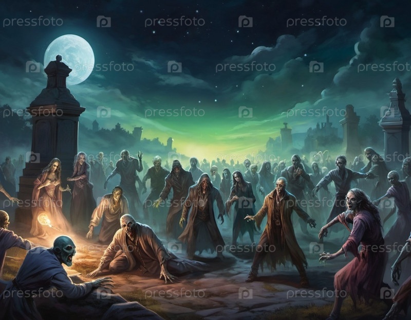 Гротескные зомби появляются из могил, разложившиеся тела освещаются лунным светом. Скелетные фигуры бродят среди надгробий, в то время как другие ползают по земле, демонстрируя свой ужасный вид. ИИ