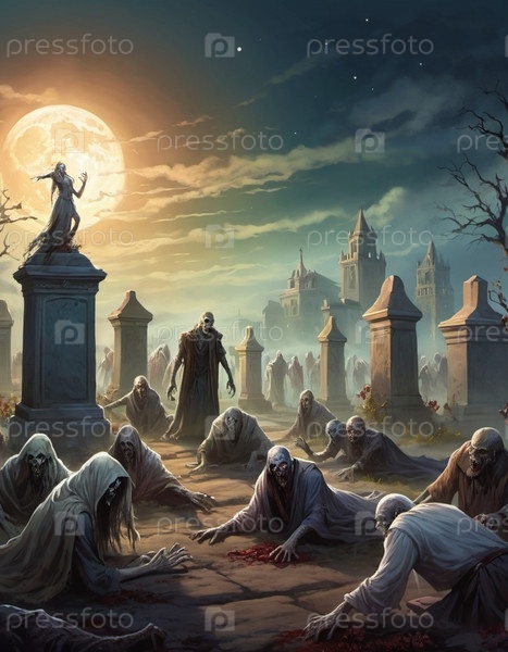 Гротескные зомби появляются из могил, разложившиеся тела освещаются лунным светом. Скелетные фигуры бродят среди надгробий, в то время как другие ползают по земле, демонстрируя свой ужасный вид. ИИ