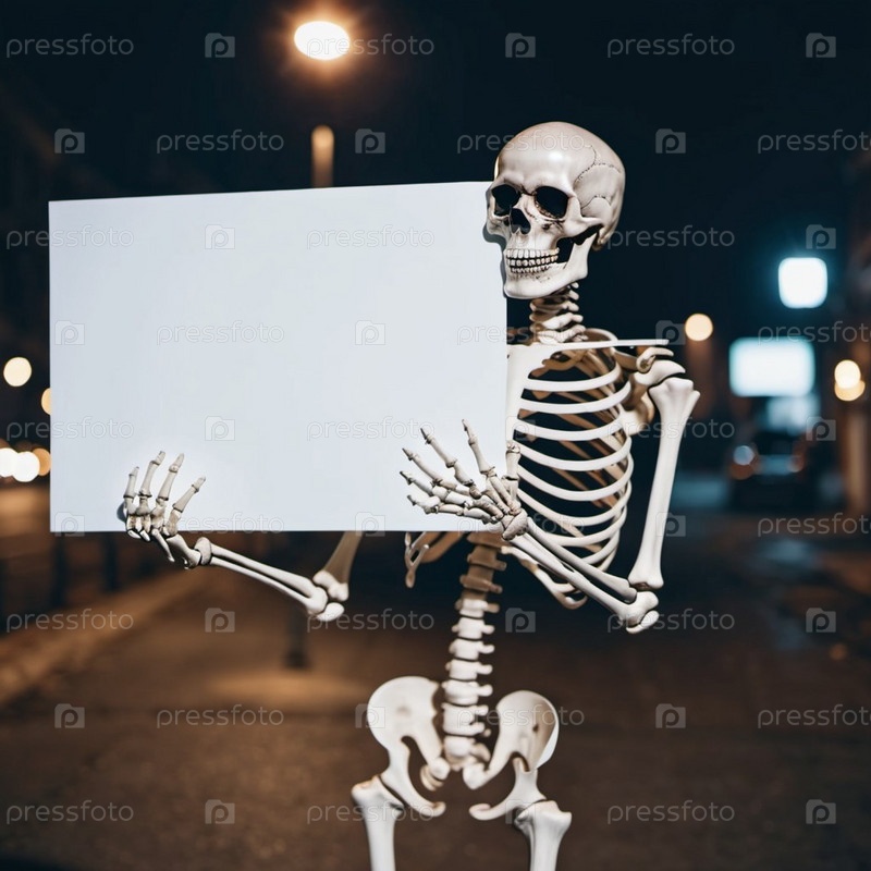 Скелет стоит в тускло освещенной городской среде ночью, держа в руках пустой белый плакат. Окрестности освещены уличными фонарями, создавая драматический контраст на темном фоне. Костлявые руки скелета сжимают края плаката, предоставляя достаточно места д
