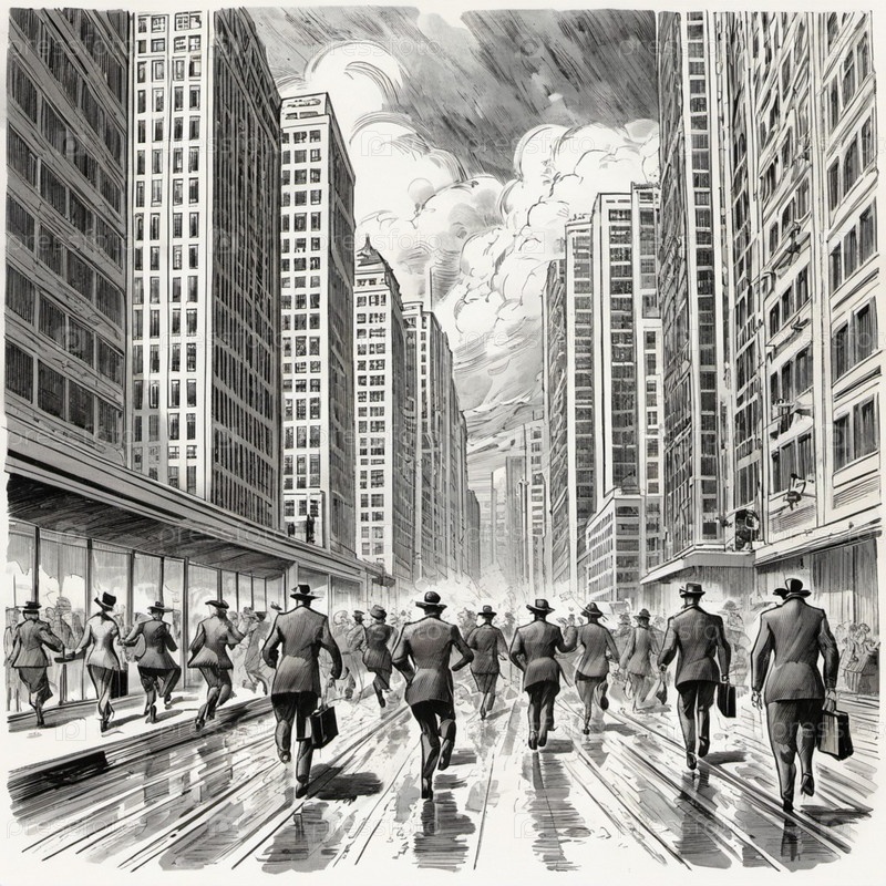Группа людей из разных слоев общества быстро идет по оживленной улице, выстроившейся вдоль возвышающихся небоскребов, что свидетельствует о ярком городском пейзаже. Похоже, они занимаются различными финансовыми делами, возможно, по пути на работу или дело