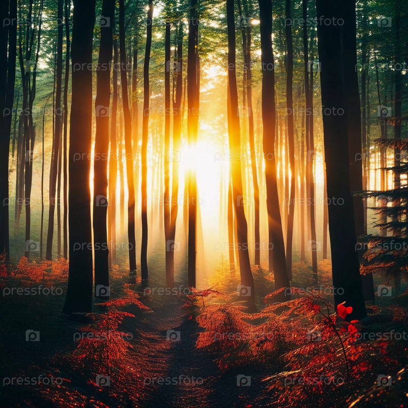 Солнечный свет проникает сквозь густой полог леса, теплые манящие лучи света на яркую зеленую листву. Спокойная атмосфера, красота природы. Богатая экосистема. Блаженная среда. Чудо природы AI