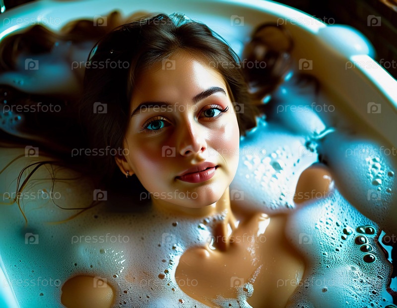 Молодая женщина наслаждается расслабляющей ванной, окруженной мягкой, пушистой пеной, в спокойной обстановке ванной комнаты днем. Генеративный ИИ