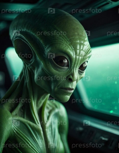 Встреча с инопланетянами в пустоте на борту футуристического космического корабля во время межзвездного путешествия через глубокий космос, раскрывающая таинственное существо. Генеративный ИИ