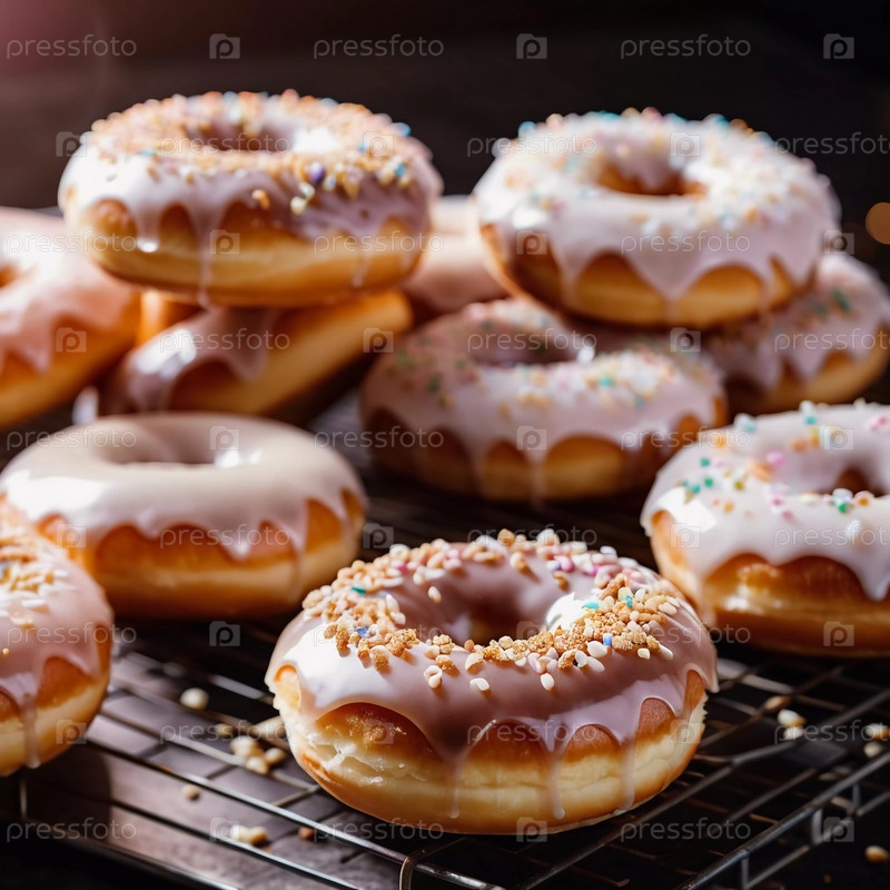 Вкусный ассортимент ванильных пончиков, покрытых кремовой глазурью и разноцветной посыпкой, демонстрирующих свою привлекательную текстуру и сладость в теплой обстановке кафе. Белая глазурь на булочках. Генеративный ИИ