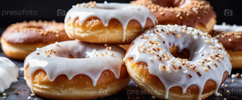 Вкусный ассортимент ванильных пончиков, покрытых кремовой глазурью и разноцветной посыпкой, демонстрирующих свою привлекательную текстуру и сладость в теплой обстановке кафе. Белая глазурь на булочках. Генеративный ИИ