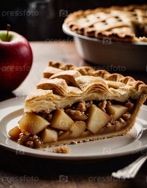 Свежеиспеченный яблочный пирог-шарлотка лежит на тарелке, демонстрируя золотистую, слоистую корочку и кусочки нежных яблок внутри, приглашая всех поблизости насладиться его теплой, домашней вкуснятиной. Генеративный ИИ
