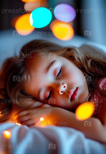 Молодая девушка с длинными ресницами мирно спит в своей уютной кровати, окруженной мягким светом в тихий вечер. Кровать освещена теплым мягким светом, который создает очаровательную атмосферу. AI