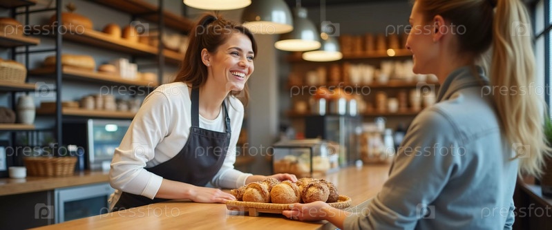 Улыбающийся пекарь держит теплую, хрустящую буханку хлеба в очаровательной пекарне, наполненной разнообразной выпечкой. Атмосфера располагает, подчеркивая утреннюю свежесть. Генеративный ИИ