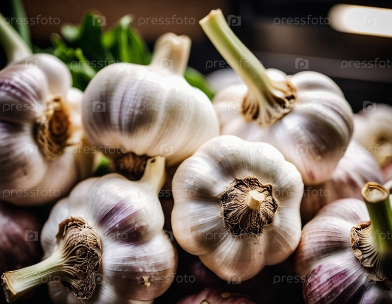 На прилавке супермаркета выложены свежие крупные головки чеснока, привлекательно разложенные, привлекающие покупателей своим ярким внешним видом и насыщенным ароматом. Покупатели ищут кулинарное вдохновение. Генеративный ИИ