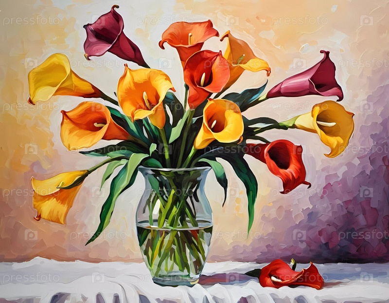 Ярко раскрашенные каллы заполняют холст среди сочных зеленых листьев, на ярком фоне, создавая привлекательную цветочную композицию. Нарисованная картина, натюрморт, основа поздравительной открытки. Генеративный ИИ