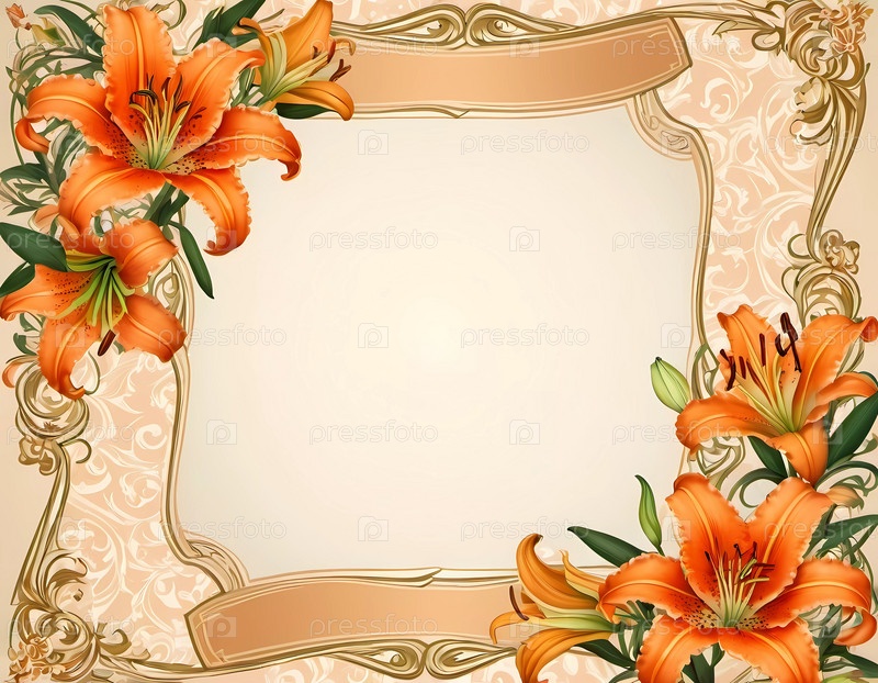 Этот дизайн представляет собой яркие оранжевые лилии, красиво расположенные на фоне пастельных тонов, идеально подходящие для приглашений или декоративных проектов. Сложная граница добавляет нотку элегантности. Генеративный ИИ
