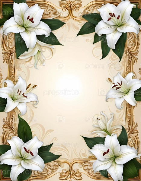 Красиво оформленная цветочная рамка демонстрирует белые лилии, окруженные богато украшенной золотой рамкой, на мягком бежевом фоне, идеально подходит для различных случаев. Генеративный ИИ