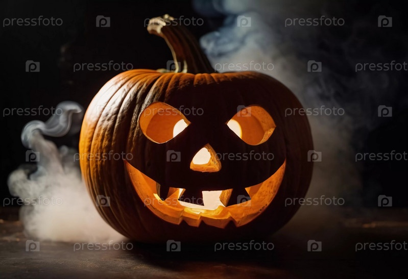Вырезанная тыква на Хэллоуин имеет угрожающее лицо, подсвеченное изнутри, с дымом, поднимающимся вверх, что усиливает тревожную атмосферу вечера. Генеративный ИИ