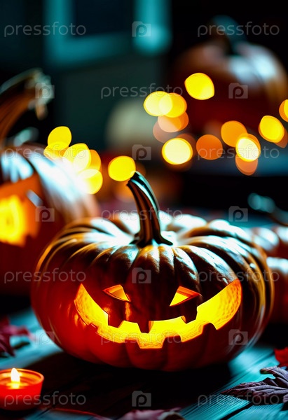 В этот Хэллоуин резная тыква излучает теплое свечение, окруженная маленькими тыквами и красочными осенними листьями, а на заднем плане мерцают праздничные огни. Генеративный ИИ