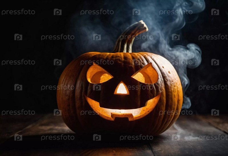 Вырезанная тыква на Хэллоуин имеет угрожающее лицо, подсвеченное изнутри, с дымом, поднимающимся вверх, что усиливает тревожную атмосферу вечера. Генеративный ИИ