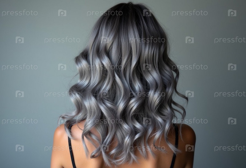 Крупный план демонстрирует красивые, блестящие серые пепельные локоны, которые демонстрируют потрясающую текстуру и яркий блеск, подчеркнутый мягким освещением. Замысловатые локоны красиво обрамляют голову. Генеративный ИИ