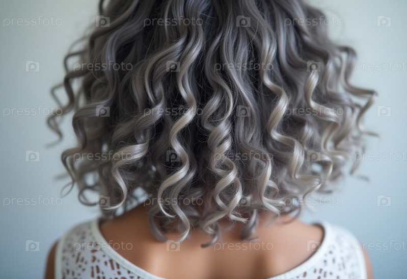 Крупный план демонстрирует красивые, блестящие серые пепельные локоны, которые демонстрируют потрясающую текстуру и яркий блеск, подчеркнутый мягким освещением. Замысловатые локоны красиво обрамляют голову. Генеративный ИИ