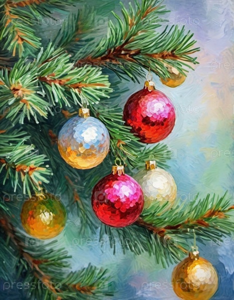 Красочные рождественские украшения украшают ветви ели, яркие шары в оттенках красного, золотого и розового, олицетворяющие праздничное настроение зимой. Художественный фон Happy New Year. Генеративный ИИ