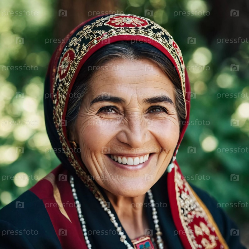 Зрелая таджикская женщина 75 лет улыбается, демонстрируя сложную традиционную одежду и богатое культурное наследие своей национальности, пробуждая мудрость и изящество. Брюнетка, в платке. AI