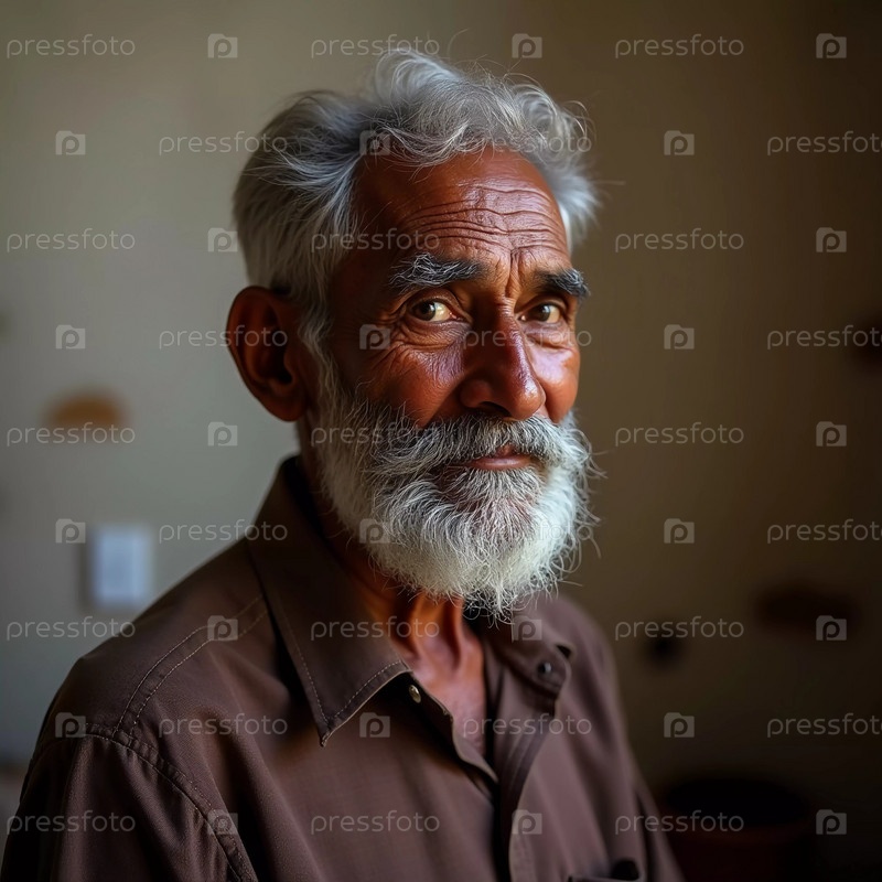 Пожилой мужчина из Индии излучает радость теплой улыбкой и мерцающими глазами. Его седые волосы и борода отражают мудрость его лет, демонстрируя жизнь, богатую опытом. Генеративный ИИ