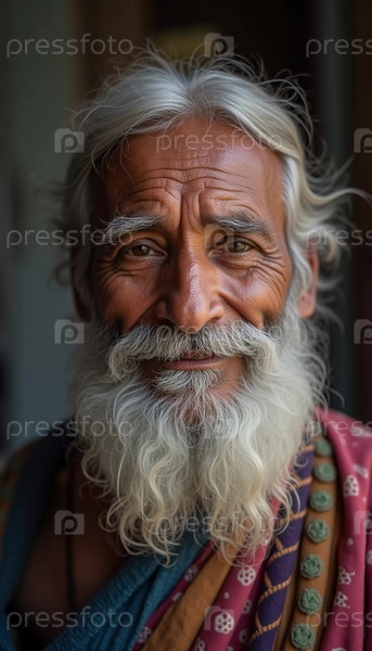 Пожилой мужчина из Индии излучает радость теплой улыбкой и мерцающими глазами. Его седые волосы и борода отражают мудрость его лет, демонстрируя жизнь, богатую опытом. Генеративный ИИ