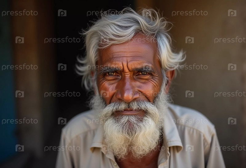 Пожилой мужчина из Индии излучает радость теплой улыбкой и мерцающими глазами. Его седые волосы и борода отражают мудрость его лет, демонстрируя жизнь, богатую опытом. Генеративный ИИ