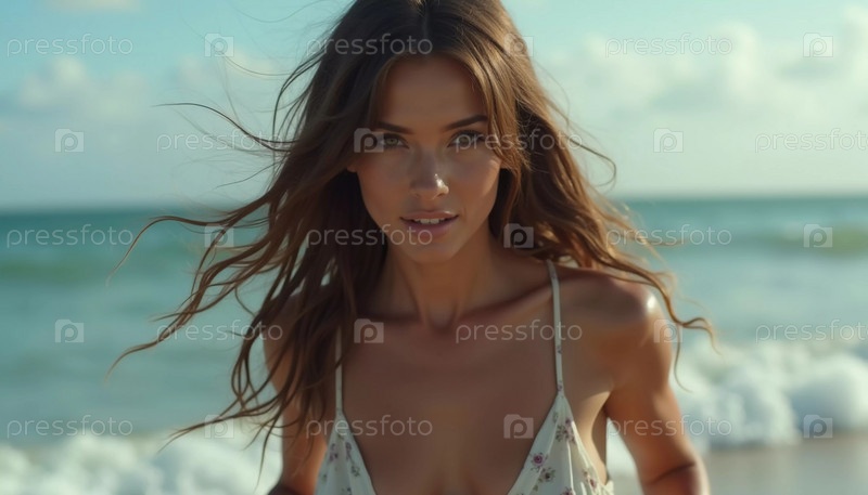 Брюнетка стоит у океана или моря, наслаждаясь солнцем и серфингом, одетая в стильный купальник, подчеркивая расслабленную пляжную атмосферу. Красивое молодое лицо. Реклама путешествий или одежды. AI