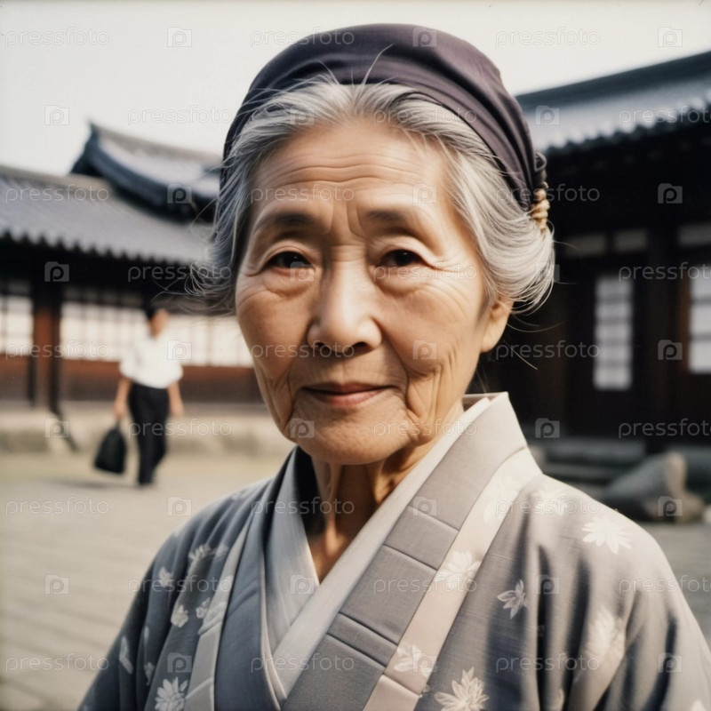 Изящная японка 70 лет в традиционном кимоно, украшенном цветочными узорами, позирует в прекрасном саду. Спокойная обстановка подчеркивает ее достойное присутствие. Генеративный ИИ