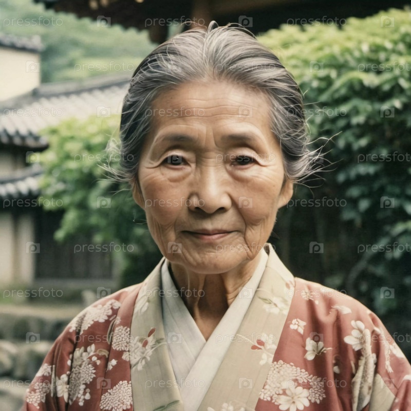 Изящная японка 70 лет в традиционном кимоно, украшенном цветочными узорами, позирует в прекрасном саду. Спокойная обстановка подчеркивает ее достойное присутствие. Генеративный ИИ